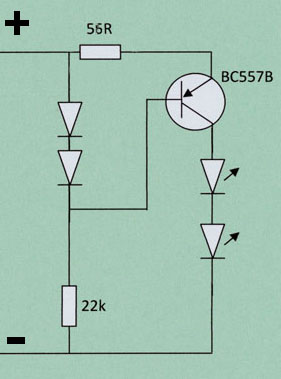 In the circuit above, a PNP transistor provides current to a pair of series LEDs via its collector lead. The voltage between the positive input and the base of the transistor is fixed at two diode drops (around 1.2 Volts). The transistor begins to pass current between its emitter and collector, into the LEDs when voltage between its base and emitter exceeds around 0.6 volts. However as soon as current flows, it also passes through the 56 ohm emitter resistor and this brings the voltage on the transistor emitter down until an equilibrium state is achieved with approximately 0.6 volts across the 56 ohm resistor. This corresponds to around 10mA of current, which also passes through the two series LEDs. Variation of the supply voltage between about 7 volts and the DCC supply volts (of 14 to 16 volts) has virtually no effect on the current through the LEDs, so their intensity remains constant.