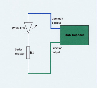 How to power your LED: The LED needs to be incorporated into an electrical circuit that controls the amount of current flowing through the LED and never applies a high negative voltage to the device. In DCC equipped locomotives, the LED is usually connected via a series resistor (which defines the current) and it is usually switched on and off by a function output on the DCC decoder (which must only apply the correct voltage polarity to the LED).