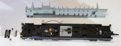 socket: After removing the 8 pin blanking plug, the original 8 pin DCC socket is removed from the floor unit by undoing the fixing screws. The leads are then de-soldered and extracted from the slots in the floor unit. The floor unit can then be separated from the chassis. The decoder and series resistors will be mounted under the floor moulding. |
