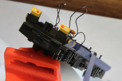 | Testing the Lights: Button 0 should activate the left hand headlight and both marker lights in the forward direction for this car and both rear lights in reverse). Button 1 should activate the hazard lights (in either the forward direction or reverse direction). (The direction of motion was found to be opposite to that expected, so the decoder orange and grey wire connections were reversed.) Programme the DCC address into the car. |