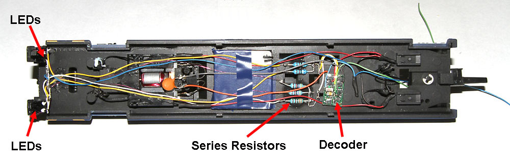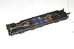 | Adding current control resistors: The resistors and the M3 decoder (as shown in the circuit diagram above) are mounted in the narrow under-floor space. The motor and wheel pick-up wires are soldered to the corresponding decoder wires, with the joints insulated using heat shrink sleeving. |