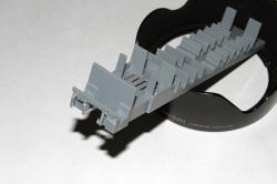 | Cosmetic Modifications: The Hornby model that formed my starting point is a First Great Western operated unit, with body colours from previous First North Western service. To convert it to current Northern Rail livery, a painting operation is required, followed by the application of Northern Rail water slide decals, obtained from Precision Labels & Decals. The door shape of the Hornby model has been superseded by 2 section doors on the real Pacer units. The 2 redundant vertical bars are therefore removed from the Hornby model, using a sharp craft knife and the remaining door frame is painted white, with yellow grab rails, to reflect Northern Rail practice. The blue roof is painted grey, using Humbrol 164 satin enamel. The yellow painted area at the front, is extended as indicated on the photo of the Northern Rail Pacer unit at the top of this page, using Humbrol 69 gloss enamel. The sides are painted in Northern Rail blue, white and purple colours. The NR blue is Revell "blue" gloss enamel 51. The NR purple is a mix of Humbrol 68 "Purple" gloss enamel and Humbrol 22 "white" gloss enamel. The straight line interfaces are masked with Tamiya masking tape and the curved interfaces are painted by eye (with a few inevitable subsequent adjustments). Orange cant rail waterslide decals (from Fox) are fitted between roof and sides, then Northern Rail waterslide Decals (from Precision Labels and Decals) are applied. NB: DO NOT use a brush coat of Humbrol Satincote over Precision Labels & Decals transfers...... I just destroyed the decals on one side of one car using this approach! ...But I should have read the instructions first. Precision Labels & Decals advise that due to the fragile nature of this type of decal, air brush varnish application is recommended, using several thin coats. Thankfully the Fox cant rail decals (which use a different form of carrier film) were fine. Fortunately I have enough spare decals to redo the affected area. Finally a pair of dummy BSI couplers are fabricated from plasticard and fitted over the two dimensional facsimiles on the chassis fronts. |
