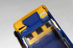 fit the LEDs: The body and leads of the 2mm tower type LEDs protrude at the rear of the light housings. To accommodate this, plastic has to be removed from the front of the floor/seating insert moulding. Also, the underside of the shelf at the base of the front windows in the upper body shell requires material to be removed in order to accommodate the top of the rear bodies of the tower LEDs. The plastic can be melted with a soldering iron, with care taken not to penetrate through to the top of the shelf. Finally, a tunnel is cut in the base of the cab section of the floor/seating insert, to route the LED wiring under the cab. Additionally, it was found necessary to reduce the width of the cab rear wall, to enable the chassis unit to be joined to the upper body shell with the floor/seating moulding in place on the chassis. (not shown on the image below). |