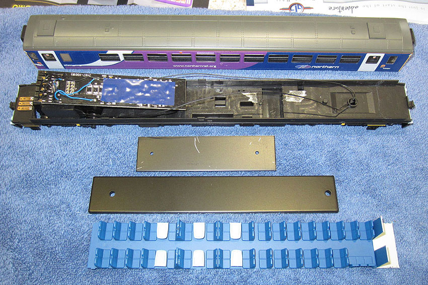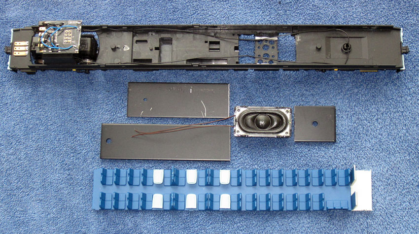 Dismantling the chassis unit: Under the seat moulding are steel plates to provide extra adhesion weight and stiffen the chassis. These need to be cut to make room for the new speaker enclosure. A hole will also be cut through the base of the chassis for the speaker. The original Hornby PCB assembly will be truncated just inboard of the 8 pin socket, to give better illumination of the passenger compartment. The 8 pin socket will be used to electrically connect the chassis and upper body shell.