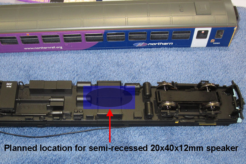 Approach: The original Hornby decoder will be replaced with an ESU LokSound V4 decoder with 8 pin connector, combined with a TCS FL4 function decoder. The use of two decoders rather than adding the LokSound adapter with Aux3 & 4 amps is intended to minimise the head height of the roof mounted decoder circuitry, keeping it all above window level. Amber chip LEDs will be fitted into recesses cut through the hazard light mouldings. The inside of the passenger area roof will be painted white and discrete chip LEDs will provide internal illumination. An ESU 4 ohm speaker (40x20x12mm) will be mounted semi-recessed in the underside of the chassis, largely hidden behind the underside mouldings. |