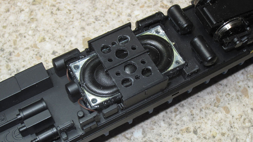 The PCB assembly was shortened using a junior hacksaw, retaining the 8 pin socket, with tracking to support the motor connections, wheel contact wires and the new speaker wires. The steel plates were sawn through to clear a gap for the speaker and the chassis underside was cut away to provide space for the speaker to be mounted semi-recessed above the battery boxes. The speaker will be installed facing downwards, held tightly in place by a foam pad under the clipped in seating moulding.