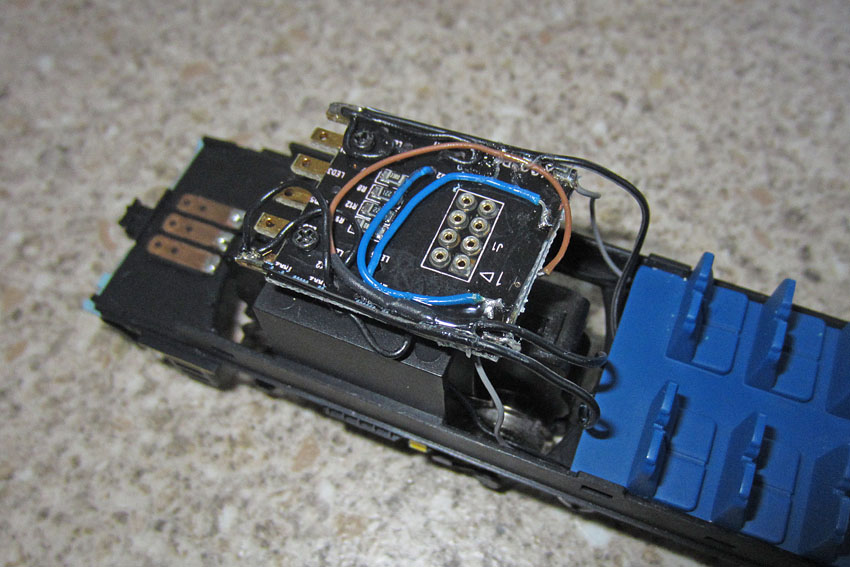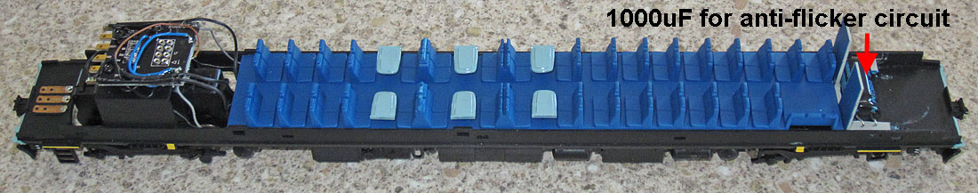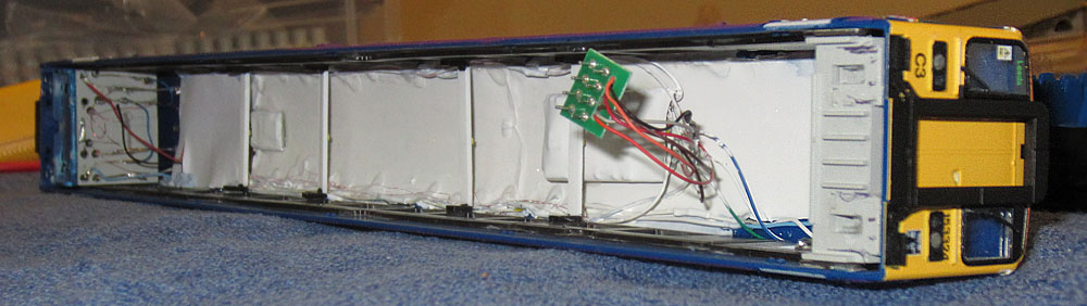 Rear end of upper body showing the Internal lighting current sources and FL4 decoder bonded to the roof The 1000uF capacitor on the chassis assembly will be connected to this circuit.