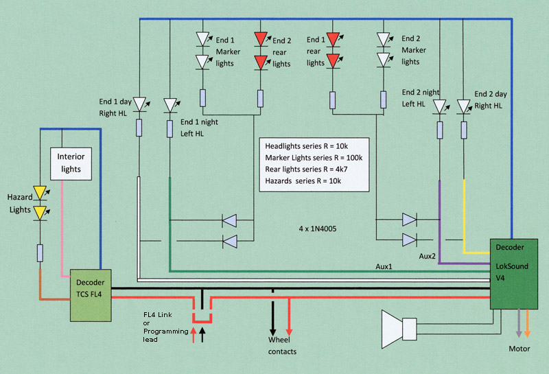 The switching transistors used with the previous circuit will be removed and the remaining circuitry will be re-built as shown above. The two decoders are connected in parallel to the track contacts in operation, but for programming, these connections need to be accessed separately for each decoder. A link plug (on the loco underside) is used to connect the FL4. This must be removed for programming activities. A programming lead is then used in place of the link plug to adjust CVs in the FL4, while the LokSound can be programmed on the track in the normal way as long as FL4 link plug is removed.