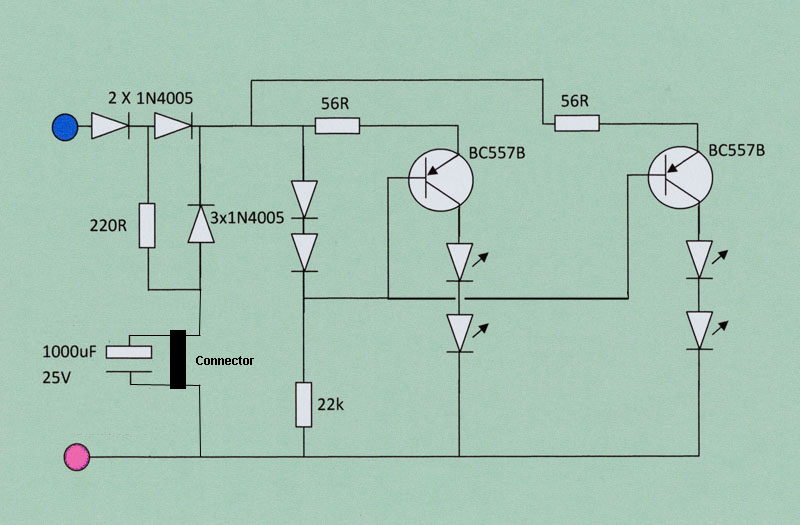 Interior lights circuit: A pair of 9mA constant current sources with anti-flicker reservoir capacitor |
