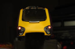 car: The modifications to the power car concern the motor wiring, which must be changed for DCC operation. Also hazard lights are fitted and a miniature connector is added, to power the hazard lights of the unpowered centre car in parallel with those of the power car. The upper body shell is separated from the chassis, by first removing the 4 screws and then easing the upper body sides apart, to release the 4 body side clips. Make a note of the orientation of the upper body shell with respect to the chassis, as it only fixes correctly one way round (due to asymmetric side clips). |