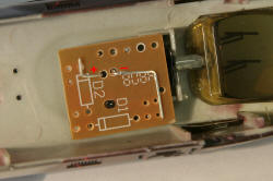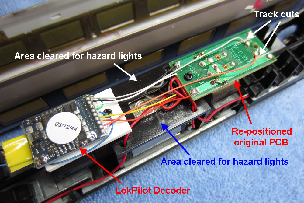 light LEDs : The clearance between the hazard light LEDs inside the upper body shell, and the original PCB fitted over the motor housing, is not sufficient to prevent a significant risk of damage when the car is re-assembled. To get over this problem, the area above the motor housing near the coach side walls is cleared by re-positioning the component boards above the flywheels. The capacitor on the original PCB is removed (not necessary in a DCC environment). However, the coils in series with each motor terminal are retained. Two track cuts are made on the PCB to separate the supply end of the coils from the wheel contact tracks. The board is then fixed to one of the motor housing screw housings, overhanging the flywheel at the forward end of the car. A 2mm plasticard shelf is screwed in place over the other flywheel and the decoder is fixed to this via an adhesive foam pad.