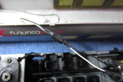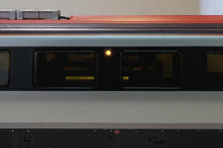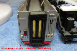 body hazard light circuit: The hazard lights are fitted in the same way as previously described for the end cars but here, a miniature connector is used to couple the chassis based circuitry to the upper body shell. Miniature connector The external connector to the adjacent car: A similar style connector is used to couple power to the adjacent centre car. This time, the socket is fixed to the end wall of the power car. The twin cables from the adjacent car will be plugged into this socket when the cars are coupled together. Inter-Car cables on a real Voyager |