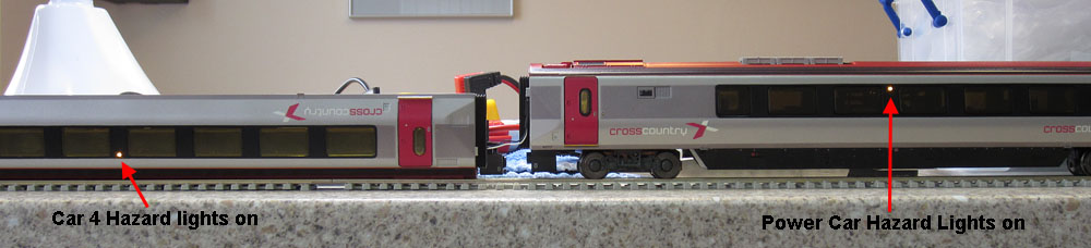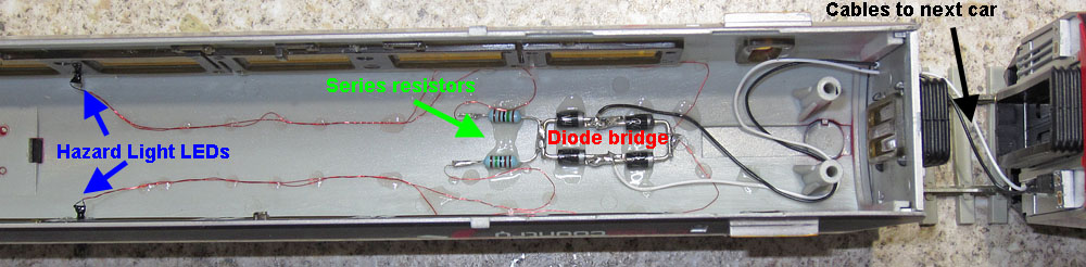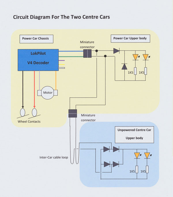 the two centre cars: Note: The diodes in the power car prevent damage to the hazard light LEDs if the connector between chassis and upper body is inserted with the wrong polarity. The diodes in the un-powered centre car, enable the hazard lights to operate with the inter-car connector connected either way round.