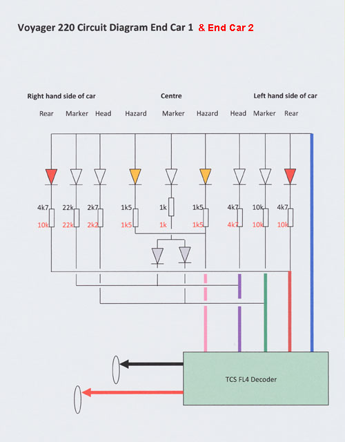 end car 1 & 2 lighting: Note: The intensity of the lights utilizing chip LEDs glued to the lens assembly can vary considerably due the loss effects of different glue thickness etc. The values shown below were established for the model concerned by experiment and will almost certainly require adjustment for other similar models. They are included here to give an idea of the likely range of values. (Car 1 in black & car 2 in red)