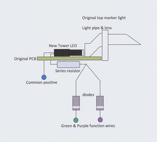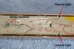 un-powered centre car: The car is dismantled and the hazard lights are fitted as before. The circuit shown in the diagram above is implemented with the parts glued to the roof underside. Holes are drilled to allow the flying lead plug cables to be inserted into the end wall of the car.