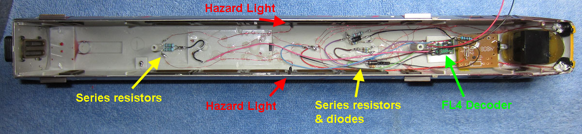 | DCC Conversion Approach: The plan is to use an ESU LokPilot V4 decoder in the centre power car and TCS type FL4 decoders in both the leading and trailing cars, providing correct operation of headlights, marker lights and rear lights during day or night running plus hazard lights for station stops. External Lighting Modifications: The Bachmann model includes bulb lighting which illuminates the external light lenses via plastic light pipes. The original lights provide correct daylight operation, but offer no night running option. The bulbs draw enough current to run hot, and have a finite lifetime. They will be replaced by LEDs. Both lower light-pipe assemblies will be removed, and the headlights, lower marker lights and rear lights, will be changed to individual chip LEDs. The top marker light-pipe will be retained, illuminated by a new tower style LED device. The DCC decoder programming will be arranged to handle correct day and night running of the lights via function buttons 0 and 1 respectively. (For day running, right hand headlight, left hand and top marker lights in the forward car plus both rear lights in the rear car. For night running, left hand headlight, right hand and top marker lights in the forward car plus both rear lights in the rear car). The hazard lights in all cars will be switched on via button 2. |
