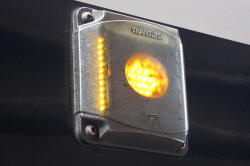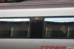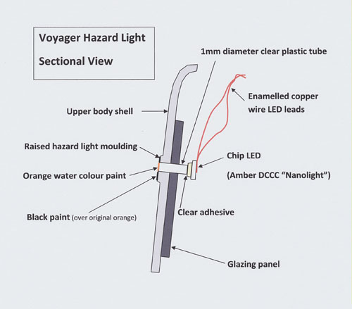 | The Hazard lights: These lights are fitted at the centre of each car on both sides. During normal operation, they illuminate only when the train is at the platform with the doors open. A 1mm diam hole will be drilled through the centre of each hazard light moulding on each coach side. A 1mm diameter short clear plastic rod will be inserted through the hole. An amber chip LED will be glued to the inside end of the clear plastic tube, providing the light source for the Voyager hazard lights. (See diagram below)