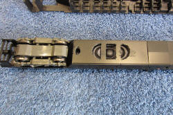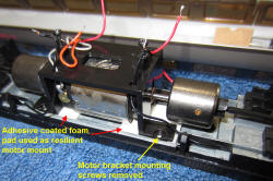 vibration: The motor in the power car is virtually silent when run with the upper body shell removed. However, when fully assembled, the upper body shell seems to act as a sound board, making the motor seem much noisier. The effect can be reduced by "wedging" blu-tack between the lower side walls of the upper body shell and the metal chassis. However I thought it worth trying to reduce the transmission of motor vibration into the chassis, so I've removed the 4 screws holding the motor bracket to the chassis and used double sided adhesive foam pads to fix the motor bracket to the chassis instead, forming (I hope) a quieter resilient mount. New resilient motor mount Postscript: This really works well....an enormous improvement on the original! |