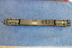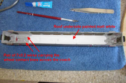 The screw bosses on top of the motor housing have also been removed to leave more room for the decoder in the roof. Two 1000uF 25V "stay alive" capacitors will be glued to the roof underside just forward of the rear bogie pivot tower. |