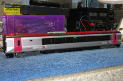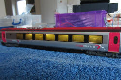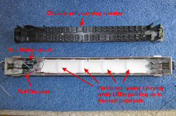 Introduction: This page provides a summary of the process adopted to incorporate a sound system, hazard lights and internal coach lighting to the Cross Country Trains variant of the Bachmann 5-car Class 221 Voyager (OO gauge). (This unit already has its primary external lighting converted to LED technology.) Note that the smaller pictures can be enlarged by clicking on the image. |