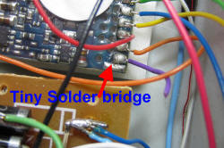 The lighting was checked after programming the decoder CV values and before re-assembly of the car. All worked as expected except for the internal coach lighting, connected to the purple Aux 2 wire. This wire was permanently negative, resulting in the lights switching on as soon as the DCC controller was switched on, with no way to switch the lights off. The spare Aux 4 grey lead was substituted for the purple lead and the CV values amended accordingly. All then worked correctly! Close up photos of the decoder revealed a tiny solder bridge between the purple wire solder pad and an adjacent track. A few careful craft knife cuts cleared the bridge and returned the Aux 2 output to normal operation (in case I have need for a further function output in the future). ESU LokPilot FX decoder fault identified |