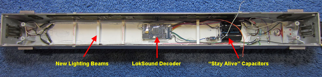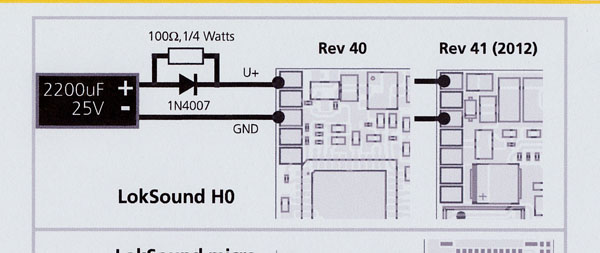 "Stay Alive" capacitor fit: A pair of 1000uF 25V capacitors will be fitted to hold up the motor and the internal lighting briefly if the track feed suffers a "brown out". I'll use a 220 ohm current limiting charge resistor and a 1N4006 diode. The ESU manual shows how the circuit can be added to the decoder.