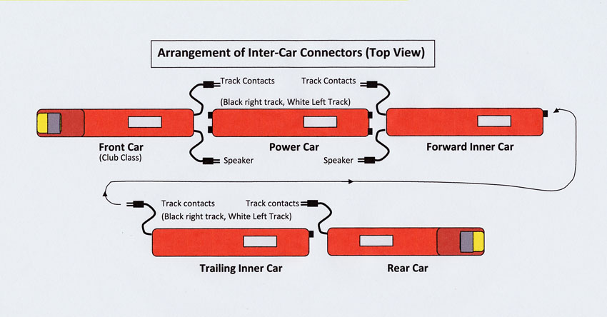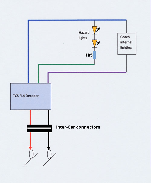 | The Decoder Arrangements: In addition to the LokSound decoder in the power car, ESU LokPilot FX function decoders will be fitted to the end cars and the original TCS FL4 function decoders will be removed from the end cars and refitted to the two inner cars. Five function outputs are needed by the end car decoders but the original FL4s have only four, hence the need to make this change. The track contact feeds from the power car and end cars, will be extended via miniature inter-car connectors, to join together and pass through the two inner cars (where the FL4 decoders will be connected). This arrangement should make the track feeds very reliable and avoids the need to fit additional wheel contacts to the inner cars.