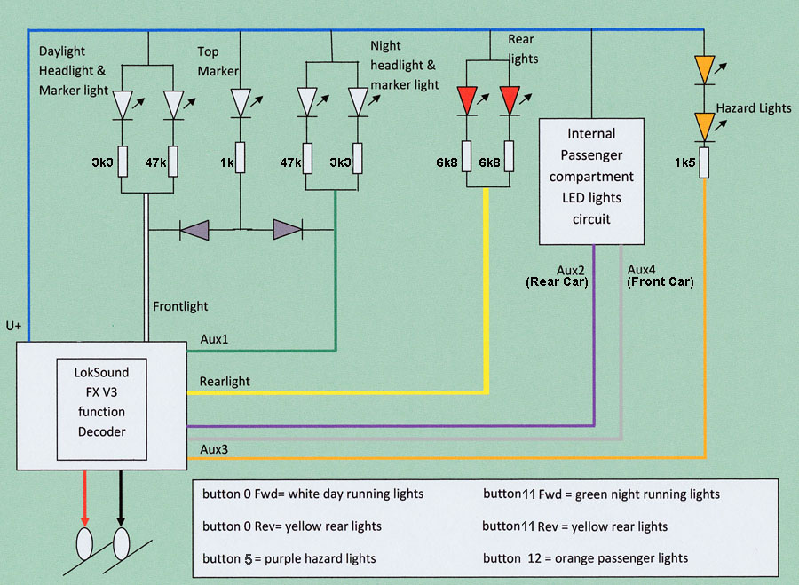 decoders: Move hazard lights to button 5 both cars: Remove from button 4....... Set CV165 & CV168 from 16 to zero. Add to button 5....... Set CV171 & CV174 from 0 to 16. Move night running lights to button 11 Lead car: Remove from button 6....... Set CV177 & CV180 to zero. Add to button 11....... Set CV207 to 4 & CV210 to 2. Move night running lights to button 11 Rear car: Remove from button 6....... Set CV177 & CV180 to zero. Add to button 11....... Set CV207 to 2 & CV210 to 4. These changes have now also been made to the programming tables and button data in the design area of the webpage above. |