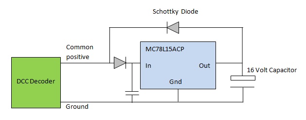 Stay Alive Capacitors: The space available within the Class 37 body work for stay alive capacitors is quite limited. About the only useful volume is in the nose sections. I can definitely get a single 1000uF 25V cap into each end, but I would prefer to double the total capacitance. I've located some physically smaller 16 Volt 1000uF caps that would allow a pair to go into each end..... but 16 Volts is a bit close to the kind of voltages that some DCC systems might throw at the locomotive....... so I'm going to experiment with a tiny low cost voltage regulator, that will protect the capacitors from excessive charging voltages. (The same approach would also offer equivalent protection to super-capacitor packs rated at 16V max.)