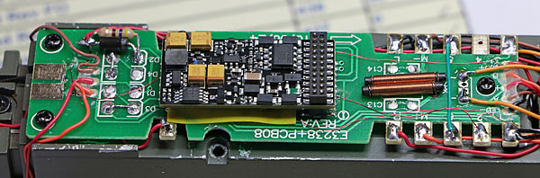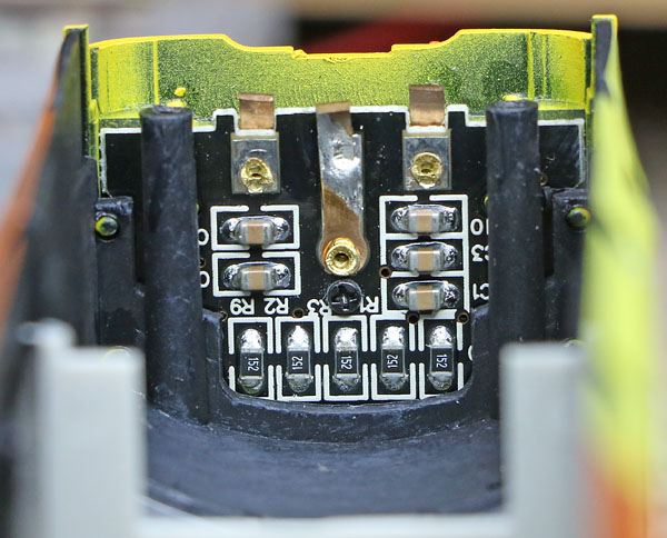 In fact, for my DCC only operation, the only surface mount component required was R11, so all the other parts except the series motor coils were subsequently removed. The additional wiring is colour coded to indicate which FO is involved and a track cut is made. The contacts for the cab light in the unmanned cab were instead used to connect to the headlight disable leads via two diodes in the upper body shell.