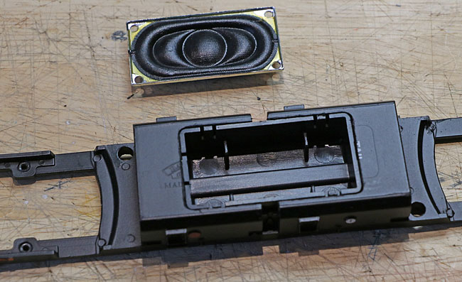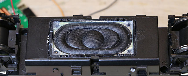 Fitting the speaker: In order to access the inside of the fuel tanks, the chassis assembly has to be dismantled. First the bogies are removed. This allows the underside screws holding the plastic sub-chassis to the cast metal block, to be unscrewed. Finally, the ballast weight within the fuel tank can be removed, together with the now redundant underside switches. There is just room to fit the ESU enclosure within the fuel tank (positioned centrally). This provides an air tight enclosure for the downward facing 50334 20x40mm speaker. This time I've cut a rectangular hole, sized so that the enclosure, with speaker installed, can be inserted through the hole in the tanks underside, from outside.