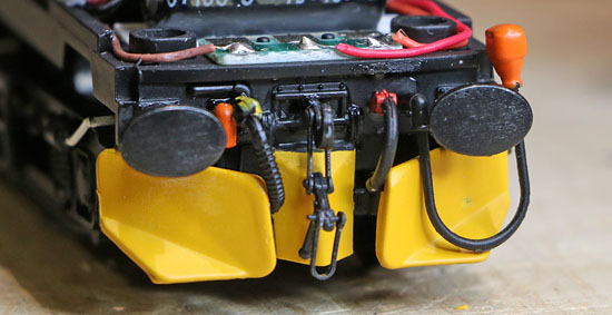 Thanks again to Kevin Bates, for kind permission to use his photo of 37421, which shows the ploughs and other front end detail. (Also confirms the technology used for the front markers!) Fitting the Ploughs: The Bachmann three blade snow ploughs are designed to plug into the bogie coupler socket. But of course, they then move from side to side as the bogie negotiates model rail scale curves.... not at all convincing! The simple expedient solution is to trim the front of the bogie coupler socket (to give clearance) then remove the coupler plug from the plough assembly and glue the plough assembly directly to the bottom edge of the buffer beam. On the rear of the loco, where a tension lock coupler is used for train haul, The outer plough blades are separated from the Bachman plough assembly and individually super-glued to the side of the coupler. These will move with the bogie but fortunately they are a lot less conspicuous than the front plough, particularly when a train is on the hook! Bachmann also provide a variety of hoses and jumper leads, plus a hook with coupler fitting. All the front parts (plus rear hook) now in place with a bit of a struggle!