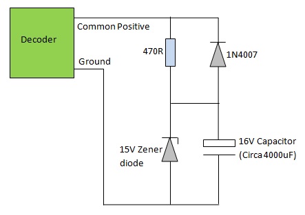 If the charging voltage is below 15 Volts, the zener diode has no discernable effect and looks like an open circuit. However, if the charging voltage exceeds 15 Volts, the zener diode acts like a clamp, preventing the voltage across the capacitor exceeding 15 Volts and conducting any excess current direct to ground. The current through the zener diode is controlled by the series 470 ohm resistor (which also prevents the large capacitor from shorting out the DCC supply). The resistor and zener diode need to be able to handle enough power without damage, to deal with the maximum DCC supply voltage that might be thrown at the circuit. A few simple sums can reveal how much power the two components need to deal with. My application is substituting 16Volt capacitors in a location that I would feel quite safe to use 25Volt types without external protection..... so I'll do the sums to see how much power the resistor and the zener would have to handle if a 25 Volt charging voltage was applied. (Although in fact I know that my own Lenz system will only ever subject the circuit to around 15Volts maximum.) So: If the input voltage is 25, then the voltage across the resistor will be (25 minus 15) Volts = 10 Volts. The power being handled by a resistor of R ohms when it has V Volts across it is (VxV)/R = 0.213 Watts in this situation. The current (I) through the resistor can be found using Ohms law (V= IxR) In this case Current = 0.213 Amps. The power being handled by the zener is voltage x current which here = 0.32 Watts So adding a little contingency, the circuit will be fine at 25 Volts using a pair of 1k quarter watt resistors in parallel to make up the resistor (so actually 500ohm rather than 470) and a zener capable of dealing with say 1 Watt or more. I've got some 1.3Watt 15V 5% zeners on the way. When they arrive, I'll give it a try! Yup! That works fine! With 25 Volts DC applied from a DC PSU instead of the decoder, the parts only get mildly warm and the max capacitor voltage (with the first zener tried) is 15.6V. My Lenz system voltage is low enough to mean that the only exercise the zener circuit would get, is in the case of some freak transient pulse response to a fault..... however, the locos might get used elsewhere, so the use of a low cost zener diode is still justified! |
