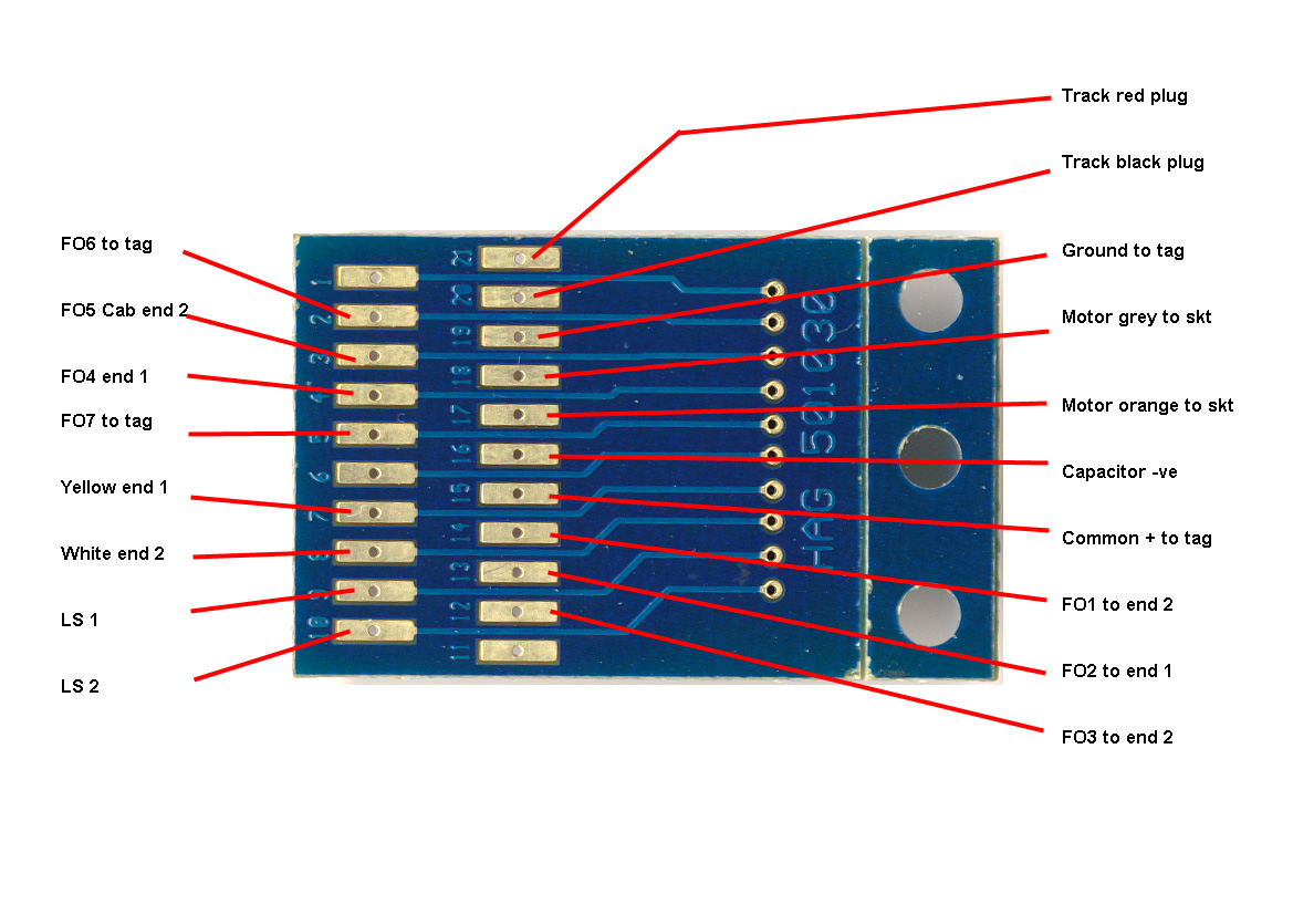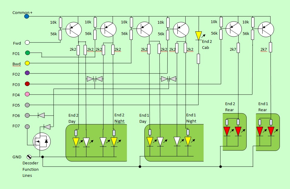 Introduction: I really like the Colas livery on Class 60 locos, so treated myself to a resprayed unit from Olivia's Trains in Sheffield as an early Christmas present :-) . Paul's Class 60 Protodrive sound project may well be refined during the life of the loco, so I've decided to fit a plugable 21 pin MX644D, via an ESU 21 pin adapter PCB, to simplify any future sound project upgrades. As a Hornby DCC ready loco, the lighting assemblies use a common negative supply, so the usual array of PNP transistor invertors are fitted on the rear of the cab bulkheads at each end. The hardware circuit is identical to the earlier MX645 equipped loco, except that as FO7 is a low current logic output on the 21 pin MX644D, I need to add an N-channel MOSFET buffer to make this output behave as a normal FO. The lighting is a similar comprehensive fit to that developed on the previous Zimo equipped DB Schenker Class 60. This time I have completely removed the original Hornby main PCB assembly, to ensure adequate head height for the plug-in decoder and to accommodate 4000uF of stay alive capacitors. |