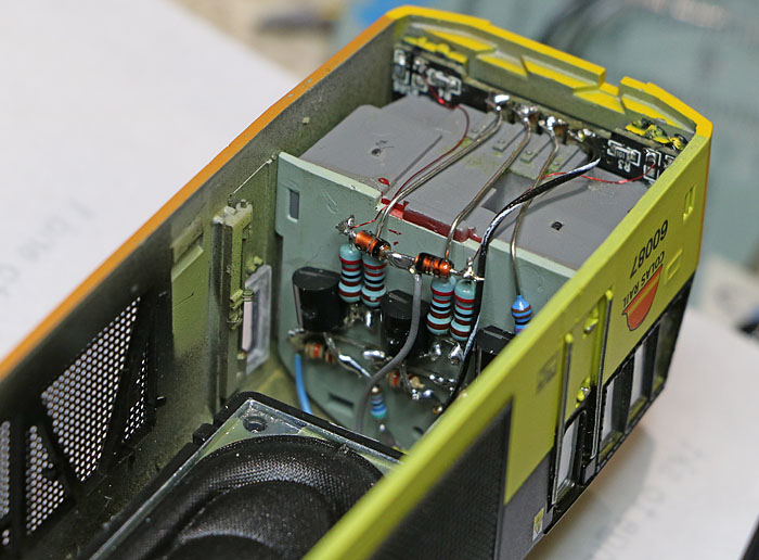 Showing the three PNP transistor stages on the rear of the number one end cab. Also, part of the 40mm x 20mm ESU 50334 speaker.