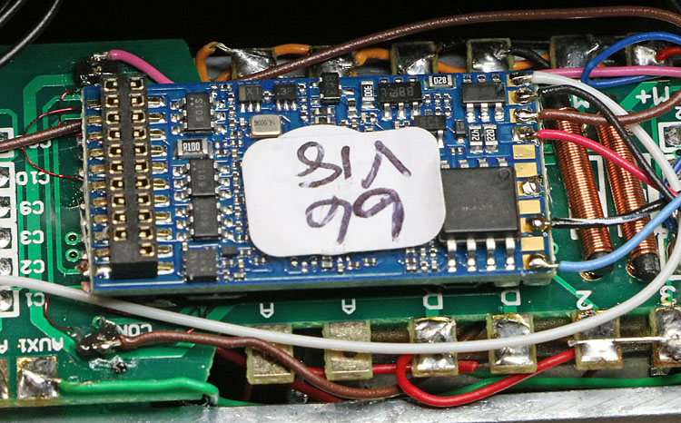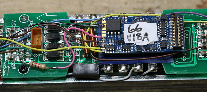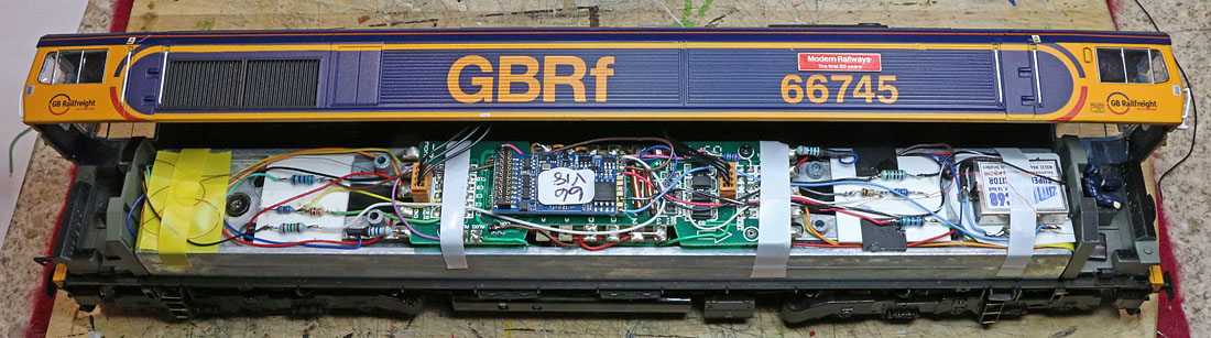 The new decoder wired in. Bif version update: The Freightliner V5 is fitted with the "Bif version 18A" sound project..... The most apparent difference between V5, Bif version 18 (in GBRF 66745) and 18A, is that 18A arrived with a linear speed characteristic whereas 18 had the V5 default exponential 1 characteristic, which I like, as it expands the slow speed region. So I promptly re-programmed the Freightliner characteristic to exponential 1.