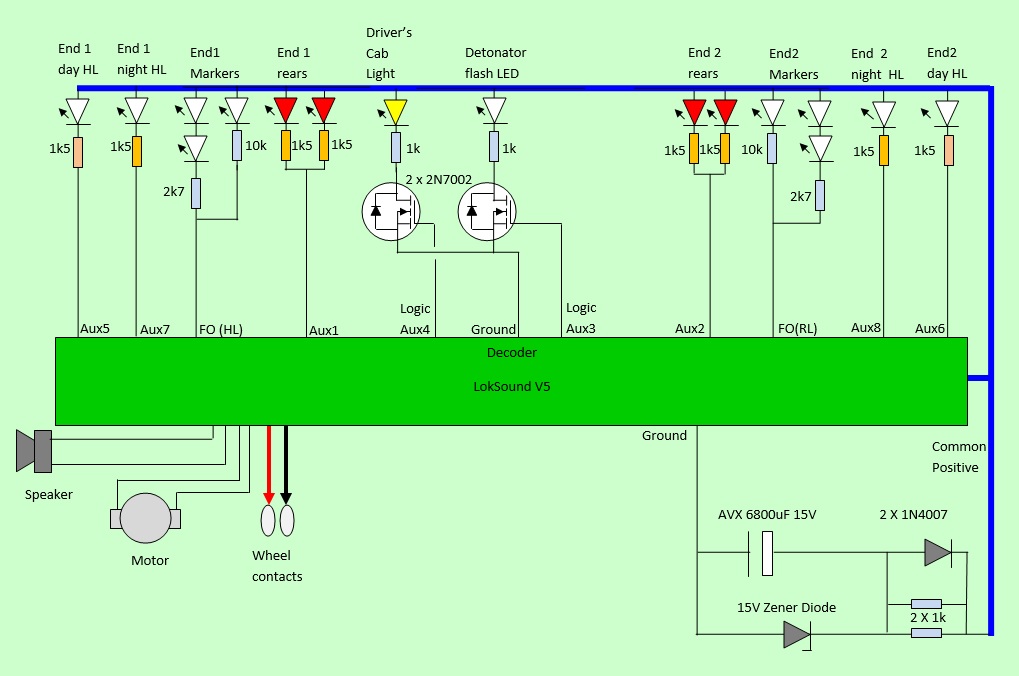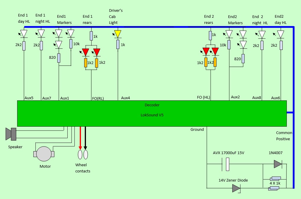 Proposed Circuit Diagram. As can be seen in the circuit diagram above, no extra buffer transistors are required, thanks to the extra full power function outputs included on the new V5 LokSound. However, Aux outputs 3 to 8 are only available as power outputs on the array of solder pads at the end of the LokSound V5 module, so these will have to be hard wired between the decoder module and the locomotive circuitry. For convenience, the stay alive connections will also be derived in the same way.