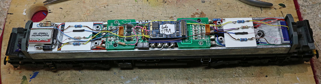 The new speaker installation. The LokSound V5 provides a good solution to control a comprehensive 66 lighting fit. The 4 dual purpose function outputs and the large number of additional full power outputs, enable the desired functionality to be achieved without any additional hardware (except for the new LEDs and their series resistors) and I prefer the very flexible ESU function mapping arrangements to the equivalent Zimo Swiss mapping scheme.