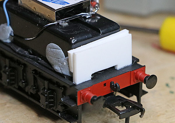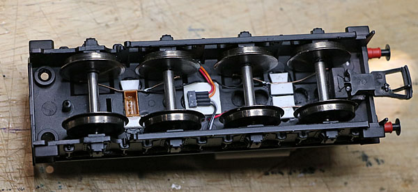 A little surgery was needed inside the tender bodywork to provide sufficient headroom for the speaker and super-cap. (New tab and slot not yet fitted on this photo, at the rear of the tender body.)