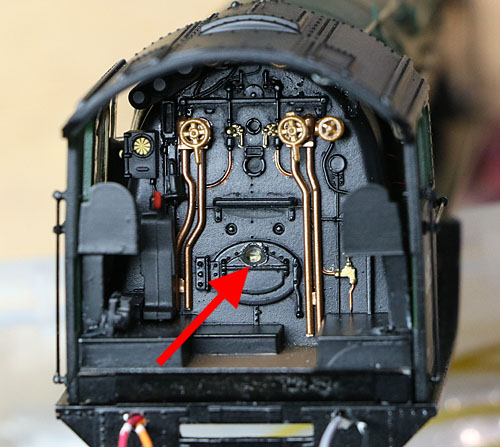 Fitting lights to the locomotive: Two DCC Concepts oil lamps are fitted (painted overall matt black, then white again, to prevent light leaking out of the body sides.) The wires are routed back to the area between cab and motor by glueing to the underside edge of the running boards. Wire & glue were then painted matt black. A hole was drilled through the metal firebox door moulding. Then the hidden side of the metal bulkhead was covered with a thin plastic sheet for electrical insulation. (With a hole cut directly behind the hole in the metal bulhead.) A red led and an amber LED were mounted directly behind the hole, using another small piece of plasticard to set them at a slight angle. The cab light LED was glued to the roof underside. All the LED series resistors were glued to the plastic substrate behind the firebox. The lighting cable, was routed out to the rear of the cab floor and is terminated in a plug that can be inserted into the socket under the centre of the tender.