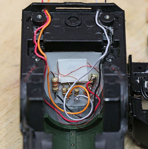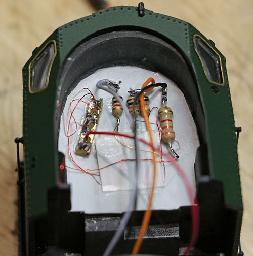 LED series resistors glued to a plastic substrate fitted to the rear of the cab front bulkhead. (Which unusually can be removed from the loco body.)
