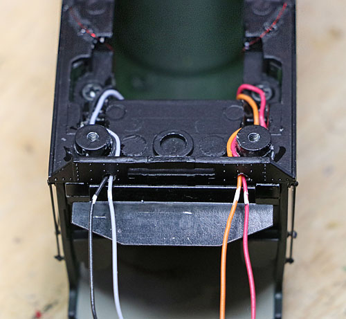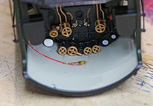 Wires to the tender emerging through holes drilled through the metal back plate. (They will be painted black.) |