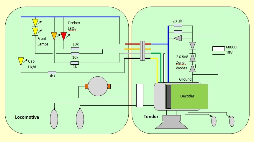 With a little surgery to the tender upper body, an ESU 50334 20x40mm speaker and the Zimo 6800uF stay-alive capacitor, can be accommodated. The 15 Volt super cap is powered by a protection circuit, to ensure that the maximum capacitor voltage is not exceeded, even if its used on a higher voltage DCC system than my Lenz unit: