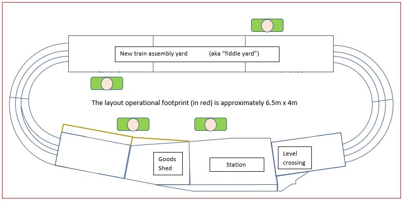 The new loop track configuration with a large train assembly yard or "fiddle yard" behind our operators.