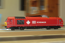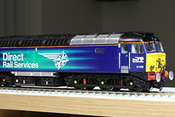Dapol Class 68 in the original DRS livery A pair of these mixed traffic locomotives were sourced upon the release of Dapol's initial batch. The lighting arrangements were customised to allow yard mode and mainbeam/dipped beam headlights. A V4 Bif sound system was installed with a bass reflex speaker in one unit and conventional 20x40mm speaker in the other. AVX 6800uF stay alive supercaps completed the fit. The limited bass output from the locomotives was supplemented by a third synchronised Bif decoder, driving a pair of hi-fi speakers in the middle of the loft layout.