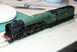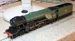 Bachmann Peppercorn Class A2 in BR livery Memories of far off train spotting days! Front oil lamps and firebox red glow and amber flicker LEDs were fitted. A Zimo sound system was installed with a 20x40mm speaker plus AVX 6800uF supercap in the tender.