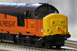 Bachmann Class 37 in Colas livery Obtained mainly to haul the ultrasonic test train after the demise of Network Rail's Class 31s. The lighting arrangements were customised to correct the marker lights colour & allow yard mode by separately enabling the headlights. A Zimo sound system was installed with a 20x40mm speaker in the fuel tank. (A Bif V5 with a better bass response speaker would be a preferred approach if done today.)